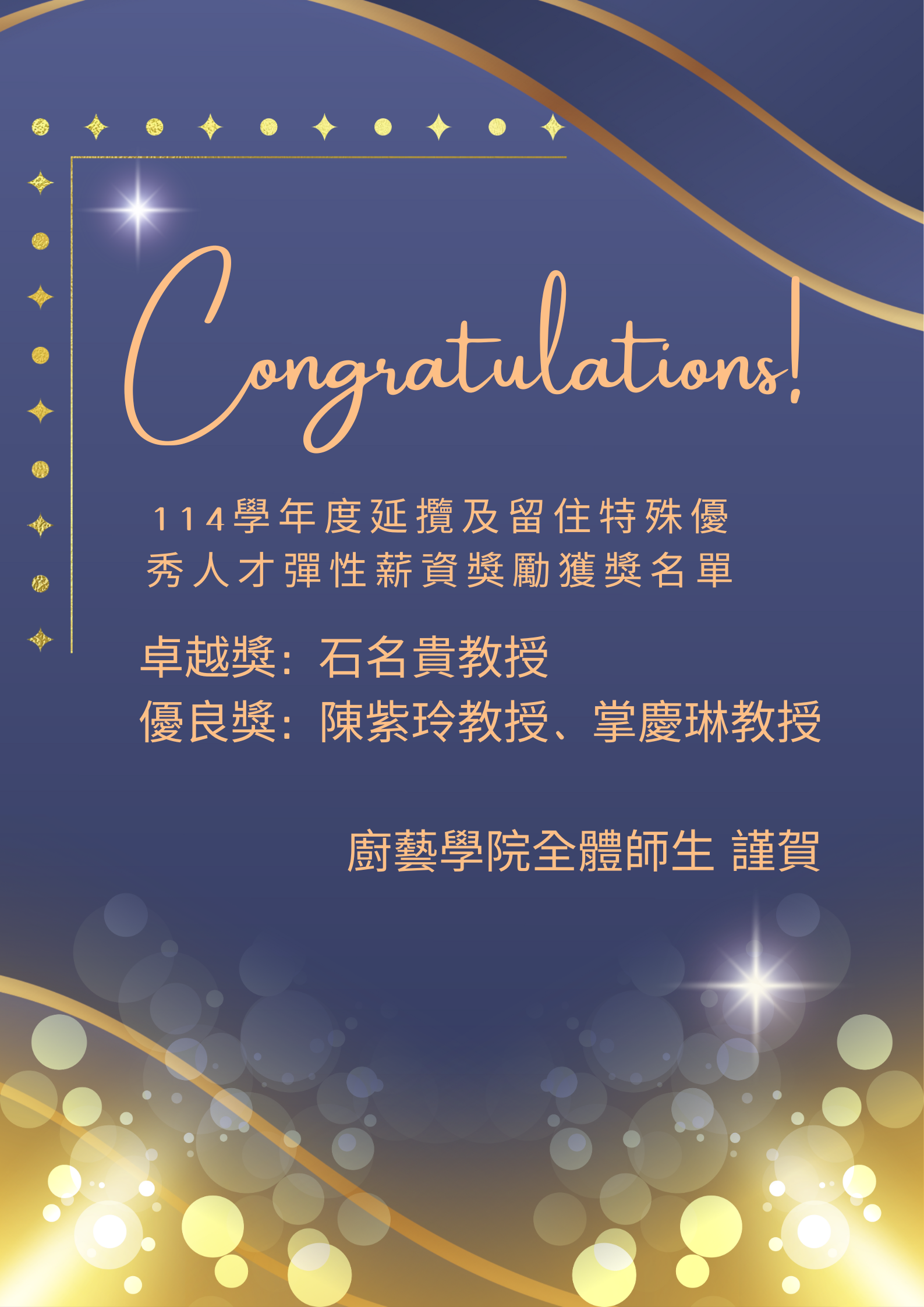賀!「114學年度延攬及留住特殊優秀人才彈性薪資獎勵」本院石名貴教授榮獲卓越獎、陳紫玲教授及掌慶琳教授榮獲優良獎!